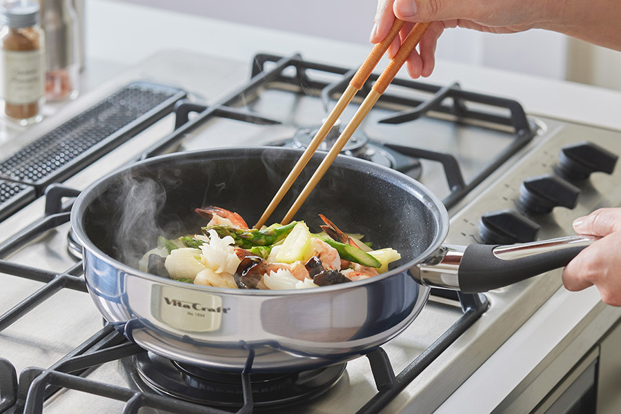 蓄熱性(保温性)に優れたステンレスと、熱伝導に優れたアルミニウムを合わせた全面2層構造。熱ムラがなく均一に素早く熱を伝えることで、料理が美味しく仕上がります。