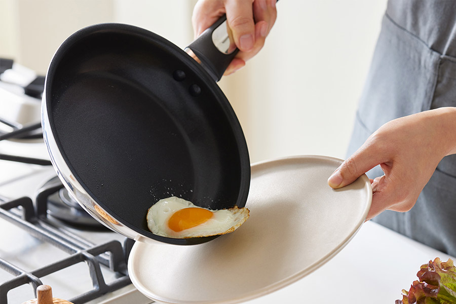 内面のコーティングは、高熱圧着法により本体との密着度をアップ。はがれに強く、こびりつきにくい仕様となっています。